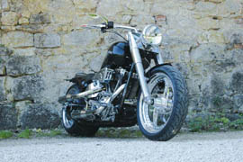 Aber alles wurde gut, die Wolken verzogen sich und jetzt konnte der Umbau ausgiebig getestet werden - Kurven gibt´s auf der rauhen Alb ja genug. Mit einem breiten Grinsen im Gesicht meldete sich Klaus wieder zurück - Zitat: „ein echter Hammer mein Bike !“. Eine serienmäßige Softail musste für den BIGfoot Umbau herhalten und wurde in den Räumen von House-of-Flames Harley-Davidson zerlegt. Es stand eben nur noch der rohe Rahmen, der auch unangetastet blieb. Ein echtes Dreambike im Original-Rahmen sollte es werden. Lediglich ein OMP Luftfilter zur besseren Beatmung und eine Supertrapp Auspuffanlage mit HPU Krümmer sorgen für Sound und dunkles Grollen. Für den 330er Gummi hatte Rick´s die passende 11,5 x 17 Zoll Felge parat. Um die tiefe Optik zu erreichen, spendierte HPU den passenden Tieferlegungs-Kit, welcher in Verbindung mit der HPU Schwinge und dem HPU Dragstyle-Fender die martialische Heckansicht unterstützt. Details, wie Rebuffini Spiegel und HPU Curved Style Griffe mit Kellermann-Blinkern lassen das Bike auch auf den 2.Blick zum Glanz erstrahlen. Der Tank wurde bei House-of-Flames Harley-Davidson gestretcht und auf die Tiefe des Rahmens angepasst - nicht´s wurde dem Zufall überlassen. Auf jeden Fall hat Klaus jetzt sein Dream-Bike für den täglichen Ausritt - Show & Fun inklusive. |