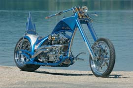 Zu „Holy Moly“ – ein Name, der 2001 in Daytona von Tom, einem Freund von Frank aus Chicago, sehr oft in den Mund genommen wurde und in der dortigen Umgangssprache mit „heilige Sch...“ übersetzt werden kann. Und so taufte man das erste Baby „Holy Moly“, denn genau diesen erstaunten Ausdruck sollte man verwenden, wenn man dieses Bike zu Gesicht bekommt. Ivonne hatte auch genaue Vorstellungen, welche Signets und Formen sich im Bike wiederfinden sollten – Herzen, Flammen, Malteserkreuz und Tötenköpfe und alles in der Lieblingsfarbe hellblau. Nach der Formfestlegung des „Stingray“ Grundrahmens von HPU machte man sich zuerst an die Felgen, denn eine Einzelabnahme für die Räder kann, wie wir wissen, einige Wochen in Anspruch nehmen. Auch das 3D fräsen der Felge dauerte seine Zeit – pro Felge vergingen 48 Stunden Fräszeit. Mit unserem Team machte sich Thomas auf die Suche nach der richtigen Form, welche nach einigen Tagen auch gefunden wurde – Yvonne war begeistert und beauftragte sofort die Fertigung ihrer Räder. HPU Eigenfertigung aus Aluminium in den Formaten 10,5“ x 18“ für 300/35R18er Heckgummi und schmalem MH90-21erVorderrad auf 2,5“ x 21“ sorgen für brachiale Optik. Der Stil war gefunden und so konnte weiter, Stück für Stück, das Bike entstehen. Bei den Grundformen des Tanks suchte man vergebens in Customizing Katalogen. Etwas Besonderes sollte her und so mussten einige Quadratmeter Blech dran glauben um eine „fliegende“ und „aggressive“ Form zu shapen. Handmade Fender und das tagelange Umschweißen der Rahmenform von Thomas Burde von House-of-Flames Harley-Davidson brachten die endgültige Form zum Vorschein. Um eine möglichst niedrige Sitzposition zu gewährleisten musste der Oiltank weichen – nur – wo sollte das notwendige Elexier gebunkert werden? Ganz klar, im Rahmen, der genügend Fassungsvermögen hat um das voll verchromte 1550er Screaming Eagle Aggregat zu versorgen. Bei der Wahl der Schwinge musste nicht lange gesucht werden, denn zum Stingray Frame bietet HPU auch die passenden Schwingen-Kits mit den dazugehörigen 75mm Getriebeversatz-Kits an – Left Side Drive in höchster, technischer Ausführung. Um auch längere Rides zu überleben, wird mittels „Legend Air Federung“ein sanftes abschwingen ermöglicht und Top-Fahrkomfort gewährleistet. Der Meister der Airbrush „Pfeil Custompainting“ wurde auf das Bike losgelassen und in Zusammenarbeit mit Yvonne wurden ihre Vorstellungen in „DreamMetall Blue“ und Pinstriping umgesetzt. Stück für Stück wurde für Ivonne der Traum zur fahrbaren Wirklichkeit und sie konnte schon im Juli ihre erste Probefahrt auf der Schwäbischen Alb absolvieren. Strahlend kam sie zurück und konnte kaum glauben einen lang gehegten Wunsch nun warhaftig vor sich zu haben – die große Prämiere war für´s Publikum auf der European Bike Week am Faaker See. Unter den strengen Augen der Jury wurde das Bike bei der H-D Velden Casino Show zur „Best of Show“ gewählt– wie gewünscht, ein echtes Winner-Bike!